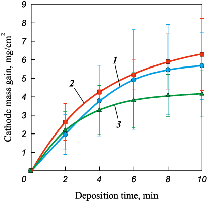 When testing new electrode materials, it is essential to record mass transfer during ESD to determine the specific mass gain of the cathode, as this parameter defines the thickness of the formed coating [21]. As the number of discharge pulses increased (i.e., with longer ESD-NLE duration), the cathode continuously gained mass (Fig. 2). Over 10 min of ESD-NLE, the total specific mass gain ranged from 4.2 to 6.3 mg/cm2. The average values were independent of the electrode type, considering the measurement error.