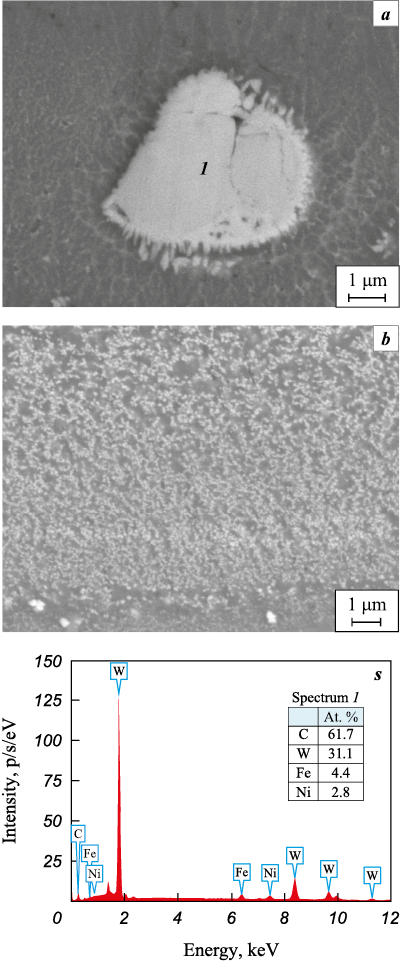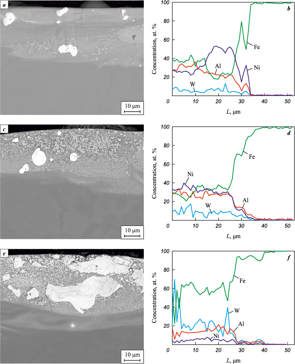 According to Fig. 4, a, c, the large inclusions correspond to grains of the initial tungsten carbide (α-WC). Submicron inclusions formed after the discharge ceased, during the solidification of the Fe–W–Ni–Al–C melt (Fig. 4, b). A similar microstructure was previously observed in ESD coatings on 35 steel deposited using WC–Co anodes [28]. Thus, the formation of WC/Ni–Al–Fe coatings via ESD proceeds through two stages: sintering of refractory agglomerated WC particles and eutectic crystallization of the Fe–W–Ni–Al–C melt [29].