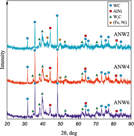 The results of X-ray phase analysis of the WC/Ni–Al–Fe coatings are shown in Fig. 5. The data indicate that, in addition to WC and W2C, the coatings contain the intermetallic compound AlNi (PDF card #44-1188 from the PdWin database) and a face-centered cubic (FCC) Fe–Ni solid solution [30], which serve as the metallic matrix. The presence of ferro-nickel is attributed to the high nickel concentration in the ANW2 coating (see Fig. 2, b). The α-WC carbide and W2C subcarbide act as reinforcing phases in the metalloceramic coating. The formation of W2C occurs due to the decarburization of WC when it interacts with the iron melt in the micro-melt pool under electric discharge temperatures [24]. This is supported by an increase in the W2C content from 14.1 to 24.1 vol. % (Table 3) as the iron concentration rises from ANW2 to ANW6 (see Figs. 3, b, d, f). Fig. 4, a illustrates the interaction between a tungsten carbide particle and the iron melt.