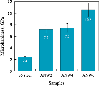 Microhardness measurements of WC/Ni–Al–Fe coatings revealed a monotonic increase in average values from 7.2 to 10.6 GPa as the tungsten carbide powder content in the NLE increased (Fig. 6). The microhardness of ANW2 and ANW4 samples remained similar (~7.5 GPa), which can be attributed to their structural similarity (see Figs. 3, a–d). Literature data indicate that the microhardness of plasma-clad (NiAl)0.8WC0.2–Fe(0–15 wt. %) coatings is significantly lower (4–6 GPa) due to their lower tungsten carbide content [17].
