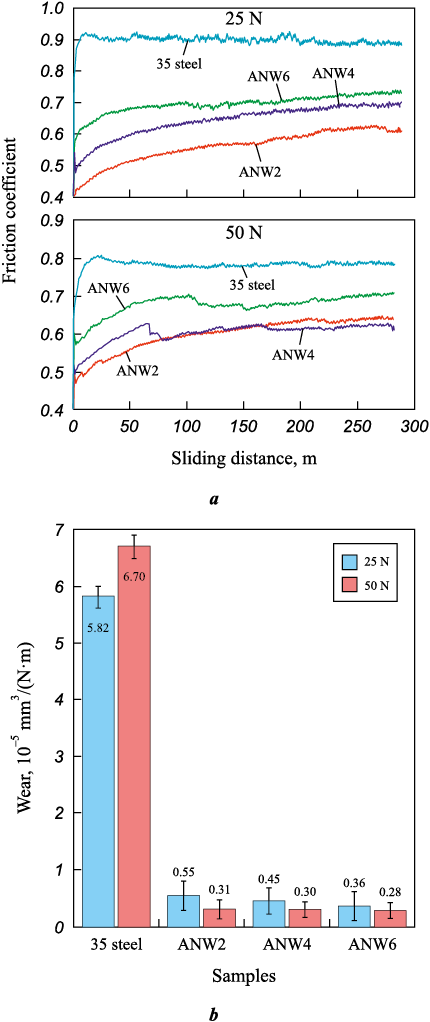 The results of tribological tests of WC/Ni–Al–Fe coatings are presented in Fig. 6. Depending on the WC concentration in the coatings, the friction coefficient varies non-monotonically from 0.61 to 0.73 under a 25 N load and from 0.62 to 0.70 under a 50 N load (Fig. 7, a). In both cases, the highest friction force values were observed for the ANW4 sample. The friction coefficient of the coatings was 8–31 % lower than that of 35 steel, demonstrating the anti-friction effect of tungsten carbide. Additionally, the amplitude of friction coefficient fluctuations for all coatings was significantly lower compared to 35 steel.
