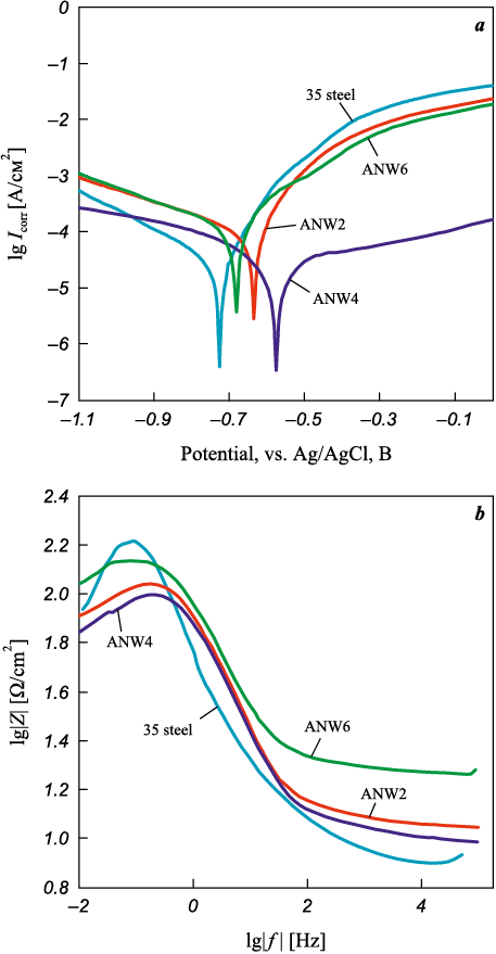 Electrochemical corrosion tests of WC/Ni–Al–Fe coatings were conducted in a 3.5 % NaCl solution using potentiodynamic polarization and impedance spectroscopy methods. Fig. 8, a presents Tafel polarization curves constructed from potentiodynamic experiments. The corrosion potential (Ecorr ) and corrosion current density (Icorr ) were determined by extrapolating the cathodic and anodic slopes of the Tafel plots. As shown in Table 4, the corrosion potential of the coated samples ranged from –0.68 V to –0.57 V relative to the Ag/AgCl electrode. The highest Ecorr value was observed in the ANW4 sample, indicating its greater resistance to spontaneous corrosion compared to the other coatings. The corrosion current density of the coated samples ranged from 3.9·10\(^–\)5 to 2.5·10\(^–\)4 A/cm2, with the lowest value recorded for ANW4 and the highest for ANW2. For uncoated 35 steel, the corrosion current density was 5.5·10\(^–\)5 A/cm2. Given that corrosion rate is directly proportional to Icorr , it can be concluded that only the ANW4 coating improves the corrosion resistance of 35 steel by 29 %.