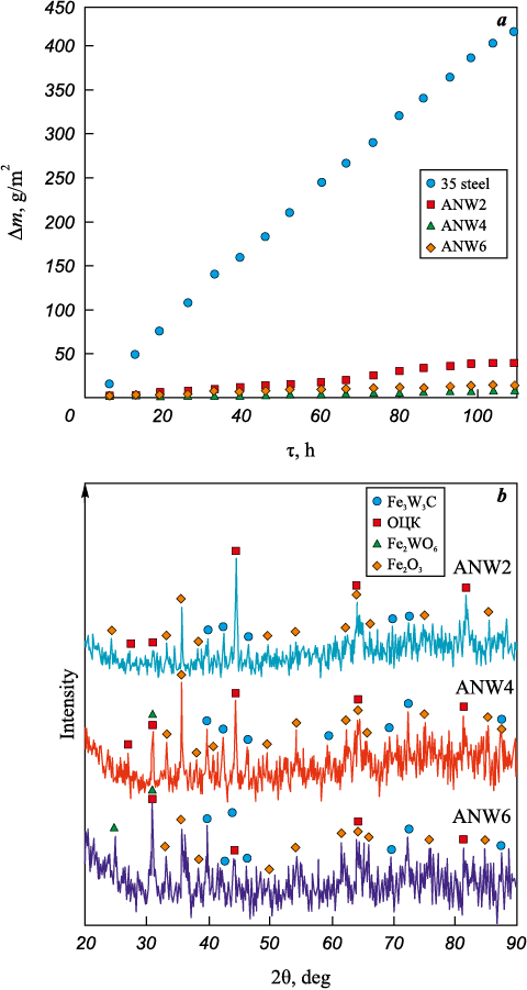 These findings indicate that incorporating up to 65 vol. % WC into the Ni–Al–Fe layer does not degrade its oxidation resistance. The ANW4 coating demonstrated the best performance, which aligns with the potentiodynamic polarization data (see Table 4). The mass gain during the oxidation resistance test resulted from the fixation of oxygen on the sample surfaces in the form of hematite (Fe2O3 ) and iron tungstate (Fe2WO6 ) (see Fig. 9, b), which forms through the simultaneous oxidation of iron and tungsten carbide: